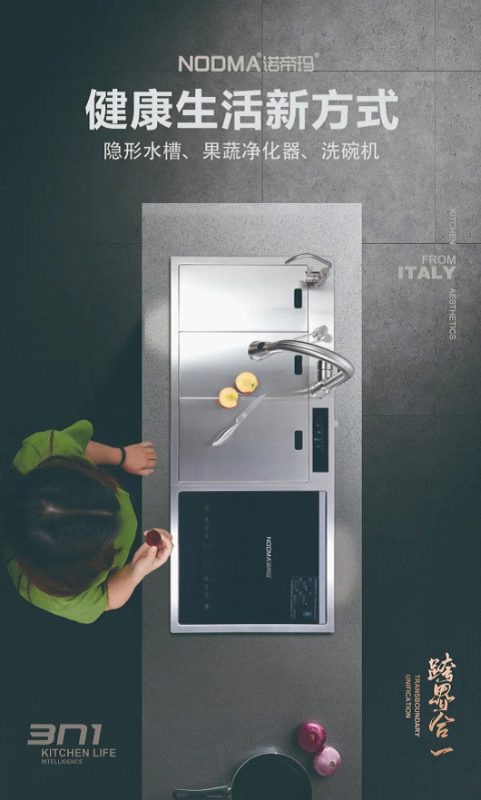 諾帝瑪廚衛通過設計,融合生活智慧與生活理念,把水槽與廚房凈洗功能二合為一,用超強的科技力量全力打造廚房智能凈洗系統,全力推動中國廚衛行業的發展。