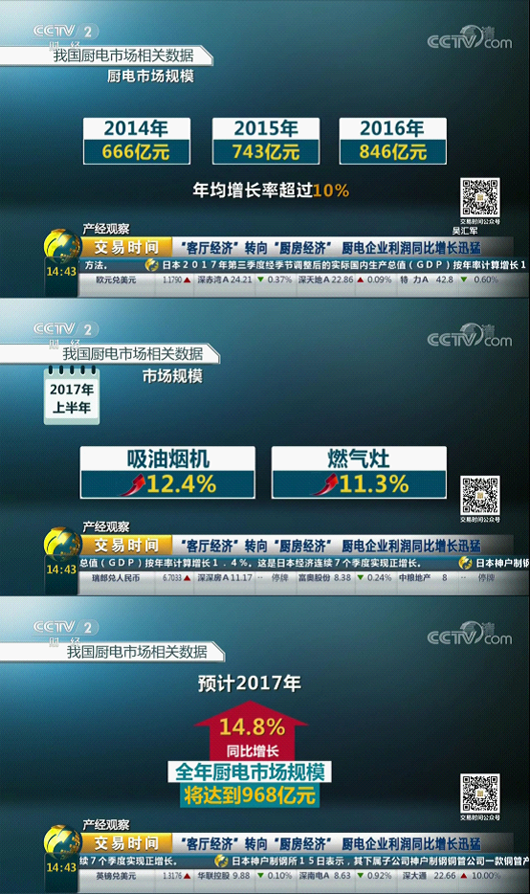 采訪中提到,在家電行業(yè)中,相比白電、黑電企業(yè),廚電企業(yè)利潤是最高的,隨著人們生活水平的提高,廚電在消費者眼中地位也越來越高,“廚房經(jīng)濟”逐步代替“客廳經(jīng)濟”,使家庭廚房逐漸成為家庭活動中心,價格也在不斷的提升。中怡康數(shù)據(jù)顯示,2014年~2016年廚電市場規(guī)模分別達到666、743、846億元,年均增產(chǎn)率超過10%,以吸油煙機及燃氣灶為代表的傳統(tǒng)廚電品類,在2017上半年,依然保持兩位數(shù)增長,分別為12.4%以及11.3%,高于整體家電市場增長速度,預計2017年全年廚電市場規(guī)模將達到978億元,同比增長14.8%。