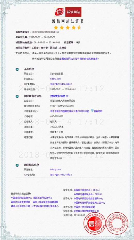漢的電氣自2006年創(chuàng)辦至今,始終秉承“敬天愛人、開拓創(chuàng)新、自強(qiáng)不息”的企業(yè)精神,致力成為高幸福指數(shù)、用戶最信賴的企業(yè),成為智能電氣行業(yè)全球領(lǐng)軍品牌!此次“國家電商行業(yè)誠信交易試點單位”實名驗證企業(yè)的認(rèn)定,是國家以及相關(guān)部門對漢的電氣工作的肯定。漢的電氣將以此為契機(jī),未來繼續(xù)扎根于行業(yè)發(fā)展,誠信經(jīng)營,增強(qiáng)公司整體競爭力,為用戶營造安全、舒適、便利、節(jié)能的環(huán)境。