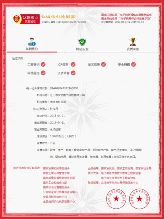 2018年8月3日,眾信電子商務(wù)交易保障促進(jìn)中心依據(jù)發(fā)改委、工信部、商務(wù)部和國資委法規(guī)政策指導(dǎo),授予江門市漢的電氣有限公司“國家電商行業(yè)誠信交易試點單位”。