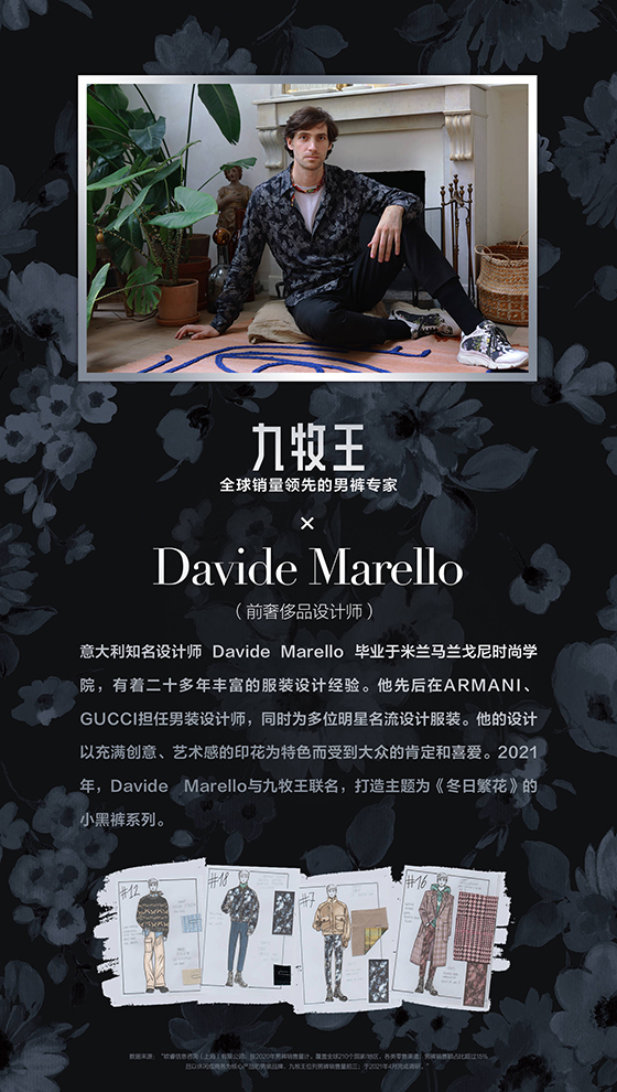 此次聯(lián)名款小黑褲的創(chuàng)意,來(lái)自Davide孕育已久的設(shè)計(jì)靈感,用印花寓意自由綻放的個(gè)性,與九牧王小黑褲彈力拉伸、不受束縛的產(chǎn)品工藝結(jié)合。對(duì)九牧王以“打造全球最好的褲子”為品牌使命,致力于打造“面料好、版型好、款式好、工藝好”的褲子,Davide欽佩不已、大為贊賞。近年九牧王推出明星單品小黑褲,彈力是普通面料的4倍①,修身不緊繃,穿著舒適、壓力小。此次合作,Davide創(chuàng)作兼具舒適和時(shí)尚性的系列小黑褲,將九牧王推向更高的時(shí)尚前沿。