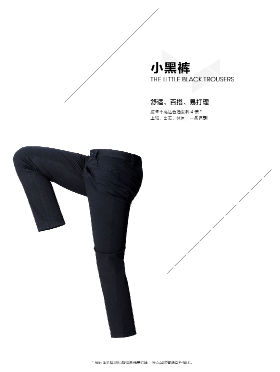 小黑褲高彈又修身的背后,是九牧王秉持匠心工藝的堅(jiān)持。經(jīng)過(guò)23000針、108道工序、30位次熨燙②、24項(xiàng)人工檢驗(yàn)等工序,才能造就一條九牧王西褲。小黑褲的傲人表現(xiàn)源自九牧王多年沉淀凝結(jié)的“黑科技”:4倍高彈面料①和獨(dú)特的織造工藝,塑造小黑褲快速回彈不變型的產(chǎn)品優(yōu)勢(shì);符合人體工程學(xué)的制褲工藝,使得坐立起行不卡、不勒,帶來(lái)舒適自在的著褲體驗(yàn)……