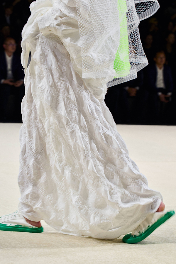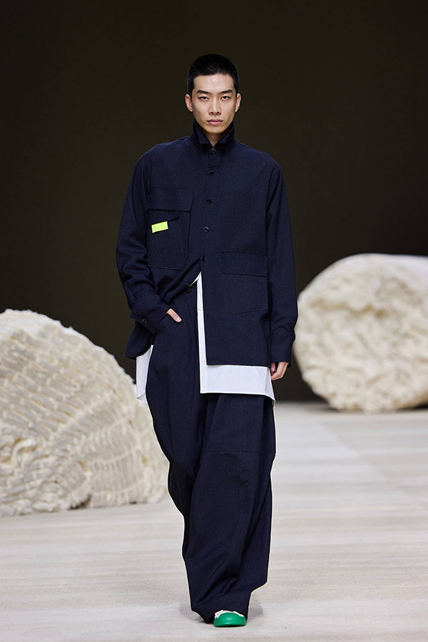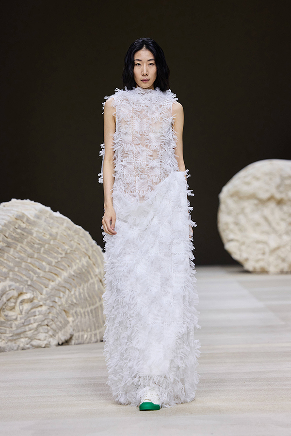 系列中大量的弧線廓形,從肩部到身體的不同部位,流暢清晰地展現了服裝的雕塑感與流動性。真正能為我們帶來方向感的,正是生命的流動,它如水流般奔走涌動,遇上島嶼礁石,激起朵朵浪花,落在土里成了棉花,飄在空中成了云朵……