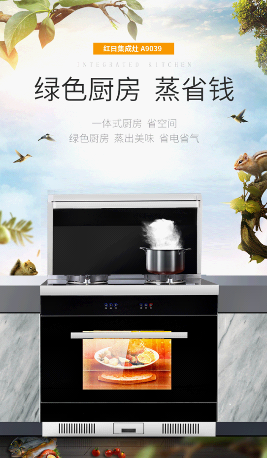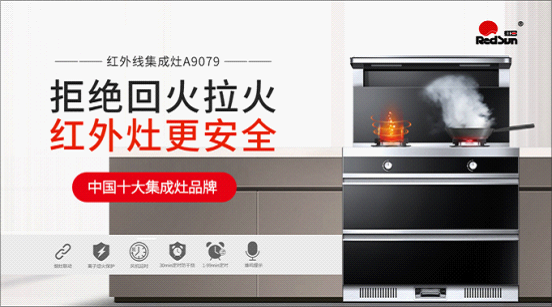 紅日紅外線一體式集成灶A9039,將采用了紅日自主研發(fā)的紅外光波技術、熱效率高達68%的紅外線燃氣灶、吸凈率可達99.96%的大吸力煙機和全方位熱能包裹的8種烹飪模式蒸箱,創(chuàng)新地有機結合為一體,給用戶帶來便捷、健康、安全的烹飪體驗。同時,其具有煙灶聯動、煙蒸聯動、防回火保護、定時防干燒、漏電保護等多項安全設計,告別廚房危險,真正做到讓消費者用得放心。