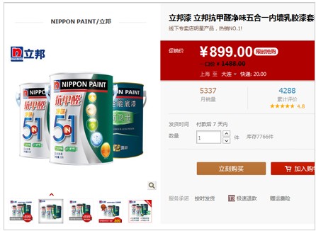 在雙蛋節(jié)來臨之至,立邦漆將會很多的優(yōu)惠,價錢更優(yōu),折扣更多。現(xiàn)在立邦漆的這款抗甲醛凈味五合一內(nèi)墻乳膠漆套裝原價1488元現(xiàn)價是899元,據(jù)了解到雙蛋節(jié)將會有更多的降價。欲想了解的朋友們就要留意立邦涂料品牌的天貓網(wǎng)了。