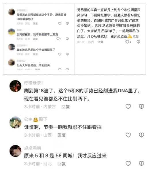 在熱點打造上,58同城的差異化優勢尤為明顯——區別于同行“官方砸錢推熱點、強制引導參與”的模式,品牌依托范丞丞的抖音人設以及TOP1級數據,打造了“無需官方號召”的自然熱點,讓熱點從“品牌營銷事件”變成“用戶自發娛樂事件”,傳播阻力更低、滲透力更強。