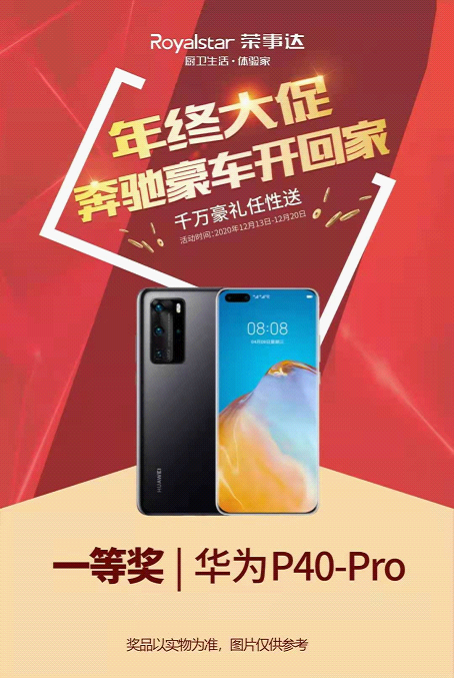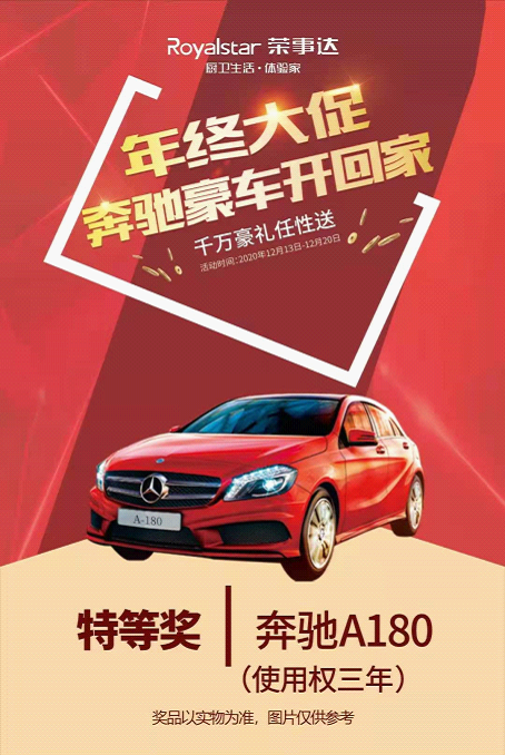 12月13-20日,榮事達廚衛電器進入“年終大促”促銷模式,致力于為消費者提供更高品質的產品和更優質的廚房生活體驗。活動期間,千萬豪禮任性送,奔馳豪車開回家,消費者只要進店購買榮事達廚衛電器均有機會將奔馳豪車開回家。