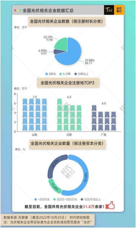 根據天眼查10月25日提供的數據,截至目前,中國共有光伏相關企業51.8萬余家,其中11.3萬家為2022年以來新增。