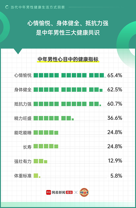 相比于用體重、強壯、長壽等生理標準來衡量健康,當代中年男性更注重全方位的身心健康指標。報告中顯示:中年男性心目中的健康指標,選擇心情愉悅、身體健全、抵抗力強的人分別占了65.4%、62.5%、60.7%,成為了中年男性三大健康共識。能吃能睡、長壽、強壯有力、體重標準等傳統健康指標的關注度則相對較低。