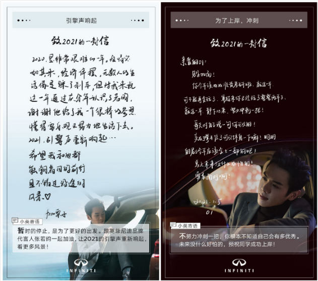 與此同時,英菲尼迪發布了定制款信紙,號召用戶和張若昀一起寫封信給2021。粉絲們紛紛響應,面對這些信,英菲尼迪也送出暖心寄語。在一來一往中,英菲尼迪與用戶達成了有效的溝通。
