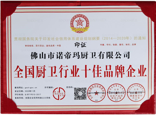 近日,諾帝瑪廚衛榮獲“全國廚衛行業十佳品牌企業”稱號。該榮譽是由中國審信核信企業信用評估中心、中國鑒優品質量認證中心、中國百行百業市場調查中心聯合頒發,是積極貫徹執行國務院關于印發社會信用體系建設規劃綱要(2014-2020年)通知的體現。
