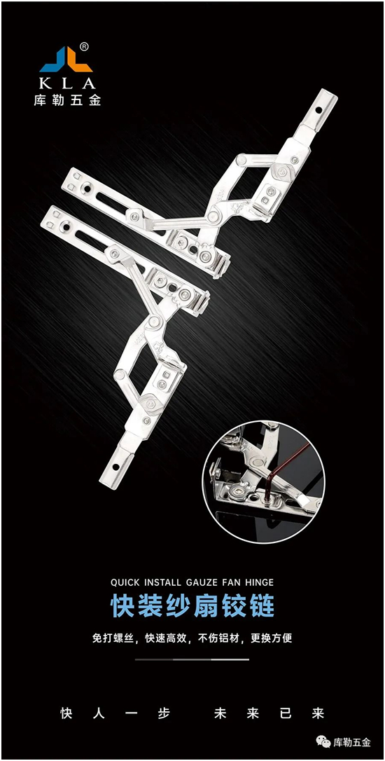 門窗行業(yè)的煥新也推動(dòng)著門窗五金產(chǎn)品的升級(jí)與發(fā)展。作為門窗五金行業(yè)先行者之一,庫勒五金持續(xù)關(guān)注著門窗行業(yè)的發(fā)展態(tài)勢。近年來,窗紗一體系統(tǒng)窗逐漸走進(jìn)大眾視野,并成為家居主流門窗。為順應(yīng)市場需求,提升用戶門窗體驗(yàn),庫勒五金積極進(jìn)行產(chǎn)品研發(fā)創(chuàng)新,重磅推出快裝并且易拆卸紗扇鉸鏈。