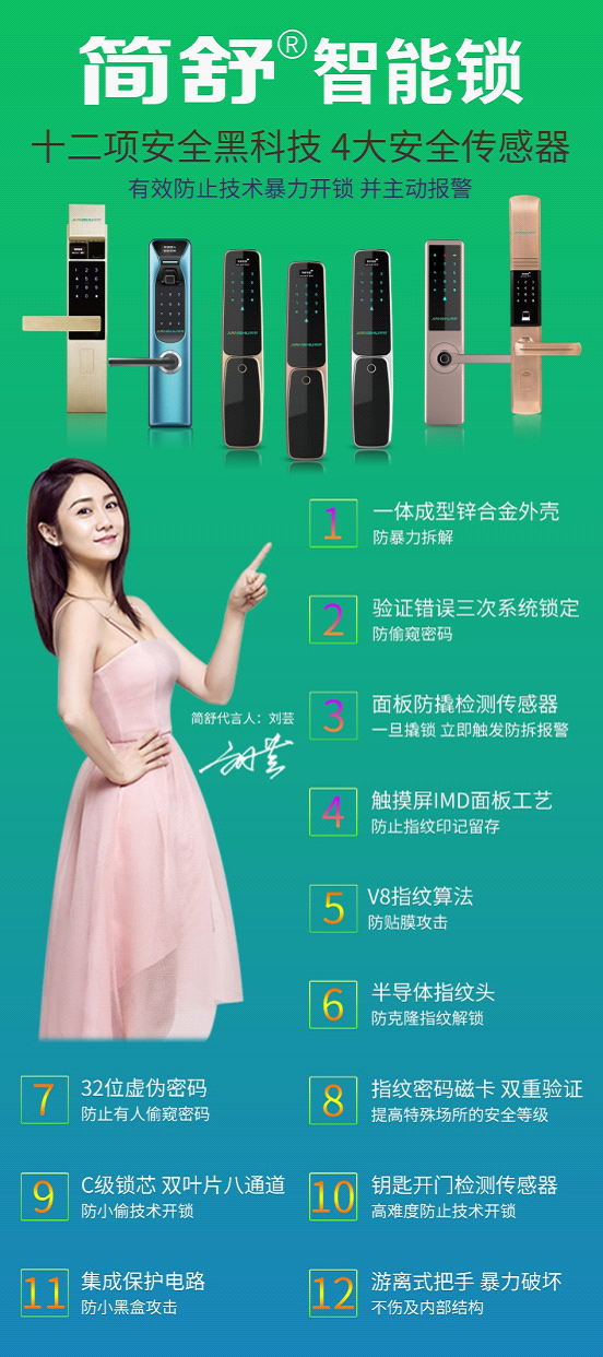 簡舒智能鎖,12項“黑科技”,每一項科技對用戶來說,都帶來滿滿的安全感,而簡舒更是在做工細節上的精雕細琢,讓用戶的滿意指數直線飆升。簡舒智能鎖從原材料選購、生產工藝及出廠檢測上,簡舒智能鎖的每一道生產工序都嚴格要求,從而保證簡舒的每一把鎖都是匠心之作。一體成型的鋅合金壓鑄外殼,讓暴力開鎖無跡可尋;活體生物識別半導體指紋頭,有效防止指紋復制和指紋克隆;304不銹鋼三防鎖體,防暴力撬鎖;4個鎖舌狀態檢測傳感器,防克隆指紋鎖;集成保護電路,防特斯拉線圈小黑盒攻擊;面板防撬檢測傳感器,一旦有人撬鎖,立即觸發防拆報警;C級鎖芯,四面雙葉片,防小偷技術開鎖;指紋密碼磁卡,雙重驗證,提高特殊場所的安全等級;32位虛位密碼,防止有人偷窺密碼,提高安全等級;游離式把手,一旦暴力破壞,也不傷及簡舒智能鎖的內部結構。