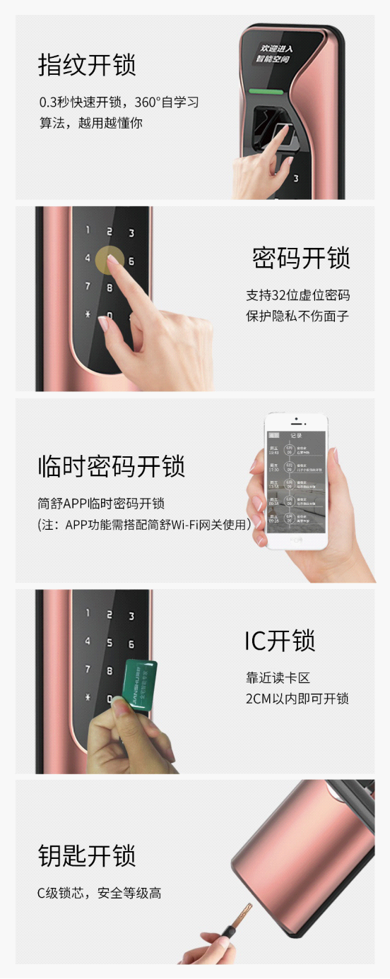 簡舒智能鎖S007可以使用五種方式實現開鎖: