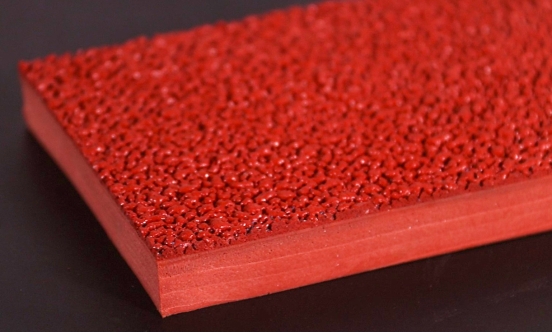 2. 面膠采用無溶劑的聚脲自結(jié)紋技術(shù),不添加溶劑、顆粒,表面自動生產(chǎn)構(gòu)造深度好的摩擦紋路。