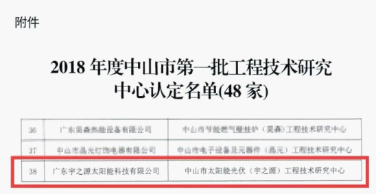 近日,廣東宇之源太陽能科技有限公司成功被中山市科學(xué)技術(shù)局認(rèn)定為“中山市太陽能光伏(宇之源)工程技術(shù)研究中心”。這一榮譽(yù)的獲得,既是政府及社會(huì)各界對(duì)宇之源整體技術(shù)水平的肯定和認(rèn)可,也是對(duì)宇之源科技創(chuàng)新工作的鼓勵(lì)和支持,標(biāo)志著宇之源的技術(shù)研發(fā)能力已經(jīng)邁入新的臺(tái)階。