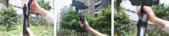 與大疆、智云等其他品牌一樣,奧川這款SMART S1手柄上也設置了萬向搖桿、調焦撥輪、模式鍵等。背部模式鍵可以自由切換“半跟隨、全跟隨、全鎖定、盜夢空間、快速轉場、歸位、POV”七個模式,支持橫、豎屏切換,滿足不同社交媒體的分享需要(西瓜、VUE等適合橫屏,抖音、快手等適合豎屏)。