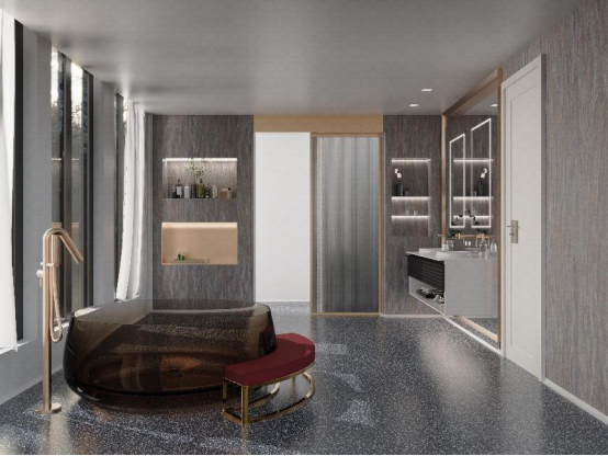 墻面和地面大面積鋪上帶有細膩花紋的人造石,彰顯大氣,其特有的無縫拼接,通體一致,質(zhì)地均勻的特質(zhì),讓整個空間充滿了一體化的藝術(shù)感。這樣的裝飾為空間增添了豐富的色彩和紋理層次,使整個空間更具有深度和立體感,打破了空間的單調(diào)統(tǒng)一。