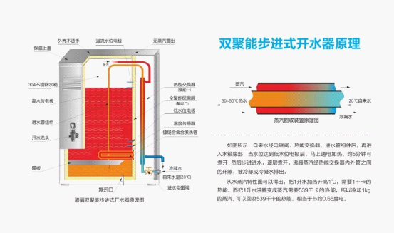 碧麗飲水設備能夠實現省電的關鍵零部件是蒸汽回收裝置,煮開水時產生的蒸汽進入裝置,20攝氏度的市政自來水吸收熱量后升溫至30-50攝氏度后再進入水箱。與此同時,蒸汽以冷凝水的形式排出,避免了蒸汽騰騰的現象,保證了碧麗開水器的安全性。在此前提之下,碧麗開水器煮開水所需的時間和電量比普通開水器少,從而讓碧麗品牌產品傲視群雄。
