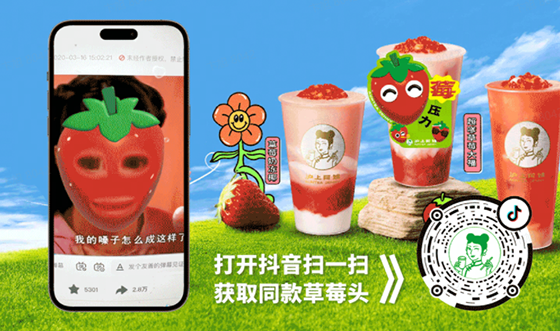 在滬上阿姨和「抖音心動新品日」IP合作中,還有特別值得一提的彩蛋玩法,滬上阿姨進一步發揮營銷創意,在線下配合新品包裝制作草莓卡片,同時和抖音平臺合作,“莓壓力草莓頭”特效同步上線,將“新奇特”不僅在產品上體現,還要通過線上線下更新奇、更具網感的的互動玩法拉近與年輕消費者的距離。