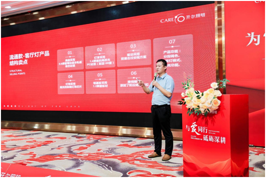 在隨后進行的營銷規劃賦能報告中,開爾照明營銷部總經理洪金波分析了開爾總體概況、2023年成就、2024年經營規劃。他提及,開爾照明同比上年度回款、出貨等指標增長20%,實現市場與口碑的雙贏。同時2024年要堅持“聚精品·擴產能·賦終端·促發展”經營指導思想,通過精準的市場定位和差異化的產品策略,搶占市場先機,深度開拓市場。洪總的報告為全體經銷商指明了發展方向,給予深刻的啟發。