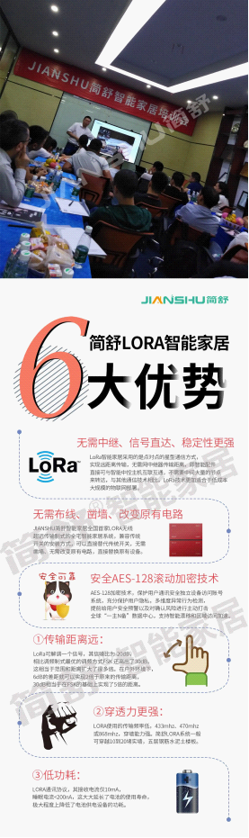徐總監深入淺出、形象生動的分享了簡舒LORA智能家居系統有何優勢,產品優勢和服務都已經成為了智能家居市場上差異化的重要競爭點,LORA作為一種能夠替代有線智能家居的無線通訊協議,整合了數字擴頻、數字信號處理和前身糾錯編碼技術,具備了信號遠距離傳輸、信號穿墻能力強(可穿8層水泥鋼筋墻)、信號抗干擾能力強(同頻率同時間發出也不會受到干擾)、系統穩定性強等天然優勢,JIANSHU簡舒智能家居作為首批LORA智能家居研發生產的優質品牌,已經落地安裝應用到多戶家庭中,取得了非常良好的口碑,解決了人們對于無線智能家居信號差、系統不穩定等不好的印象。