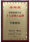 經過22年的自立自強艱苦奮斗,萬象品牌憑借過硬的環保品質、絕對的行業領導地位、廣泛的市場口碑,連續多年斬獲“中國最具影響力品牌”、“中國十大板材品牌”、“中國十大工程板品牌”、“中國十大健康板品牌”、“中國環境標志產品認證”、“家具板十大品牌”、“環保板材十大品牌”等多項榮譽稱號,為品牌實力加冕。