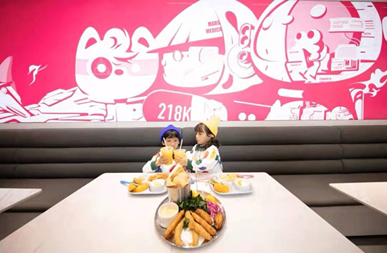 如果親子樂園僅限于游樂設(shè)施或創(chuàng)新設(shè)計主題,未免顯得過于單薄,在Mini Mars親子樂園蘇州店,也有餐廳和派對房等生活化場景的設(shè)立,限定賽博太空風格、簡約燈光元素的加持,在這兩個“標準化”的功能區(qū)考慮到了多元群體的體驗需求,實現(xiàn)“不標準的標準化”, 不僅全方位地提升了孩子的審美,家長也能夠借助炫酷的風格打卡社交。