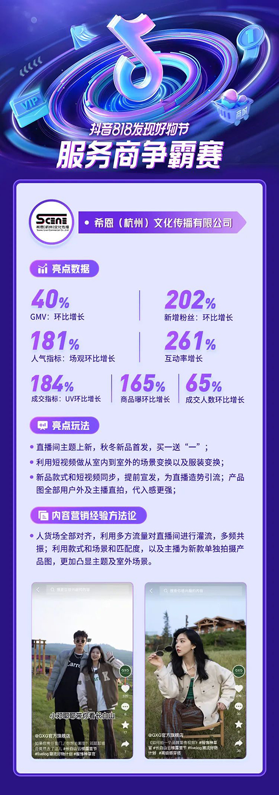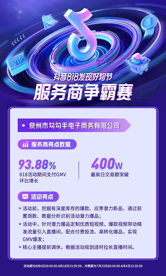 在本次抖音818服務商賽道系列活動,借助夏日內容營銷場景、818全民狂歡氛圍、直播場景的和轉化鏈路的全域化創新,品牌、產業帶服務商與商家的合作進一步升維,找到進一步實現生意增長的方法論。