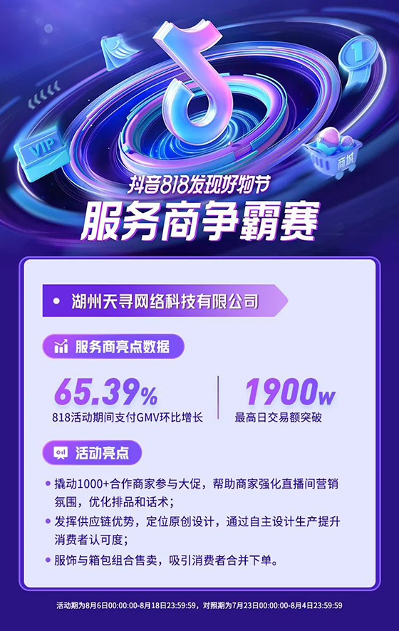湖州天尋網絡科技有限公司專注于服務童裝行業。活動期,湖州天尋撬動1000+合作商家參與大促,優化排品和話術;發揮供應鏈優勢,定位原創設計,通過自主設計生產提升消費者認可度;服飾與箱包組合售賣,吸引消費者合并下單。818活動期間支付GMV環比增長65.39%。