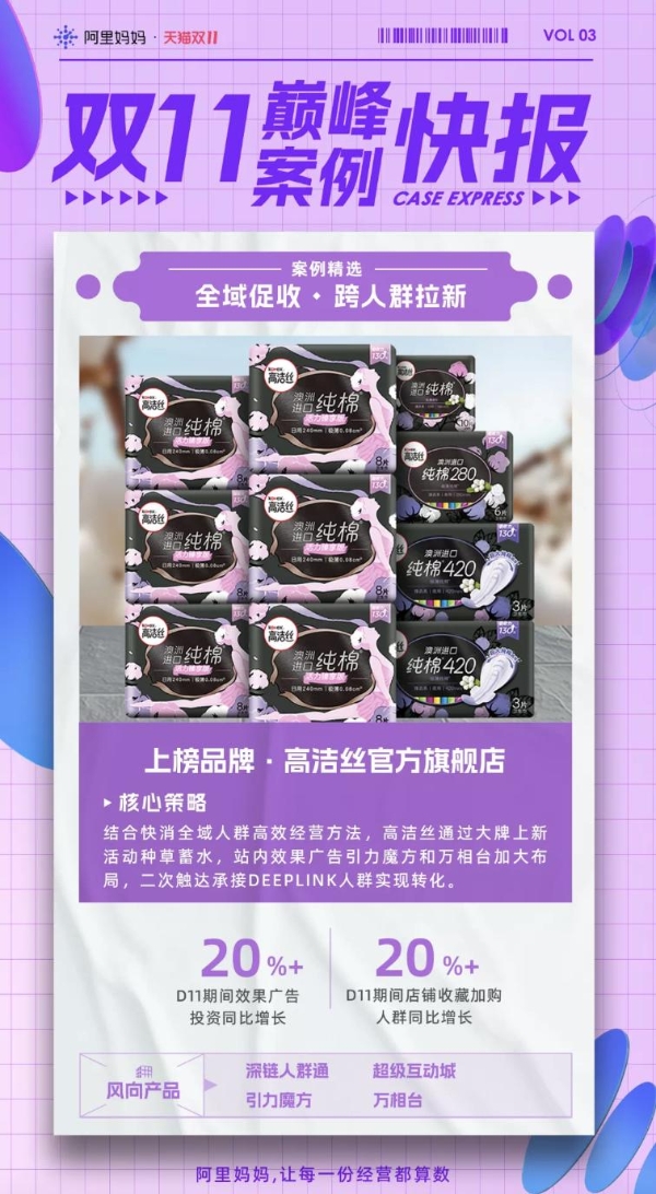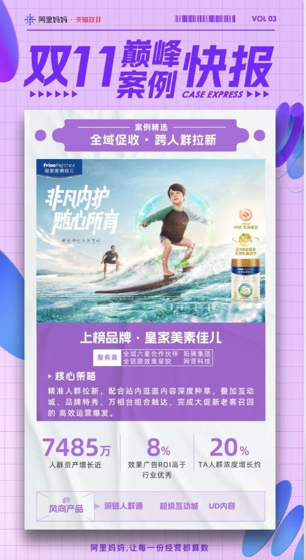 陽獅和網(wǎng)營幫助皇家美素佳兒、高潔絲、皇家美素佳兒,以及威萊、維達(dá)等品牌結(jié)合快消全域人群高效運營營銷方法,在第三波段依然實現(xiàn)了大促新客招攬與老客召回的高效運營爆發(fā)。