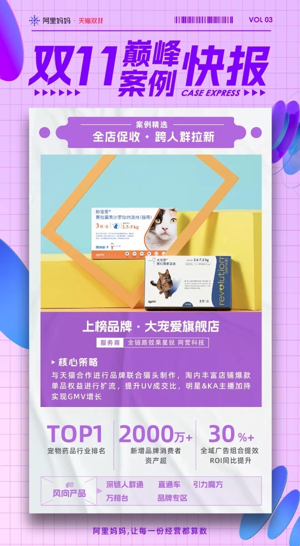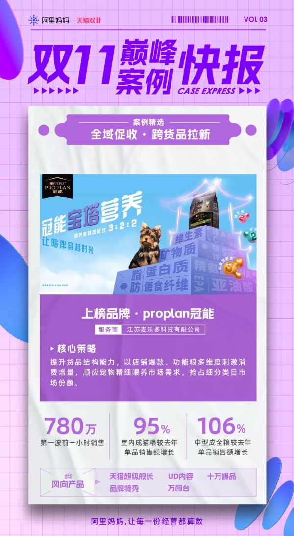 hazzys、Jack&Jone,以及麥樂多助力的ProPlan冠能、D1M電商科技助力的千趣會、艾倫助力的Timberland、上海荔之助力的亞朵星球等品牌都在提升跨貨品拉新能力,以趨勢尖貨和新賽道品類拓展核心客群,多維度刺激周期內(nèi)消費增量。其中麥樂多更是通過“雙11天貓超級艦長”經(jīng)營IP,結(jié)合站內(nèi)會場資源,從人群、貨品、環(huán)境等不同角度出發(fā)洞悉新趨勢、鎖定新機(jī)會,為ProPlan冠能實現(xiàn)品類升級和銷量增長。