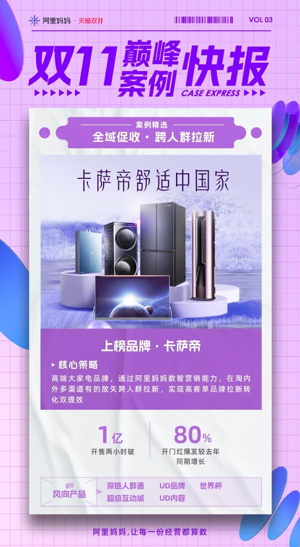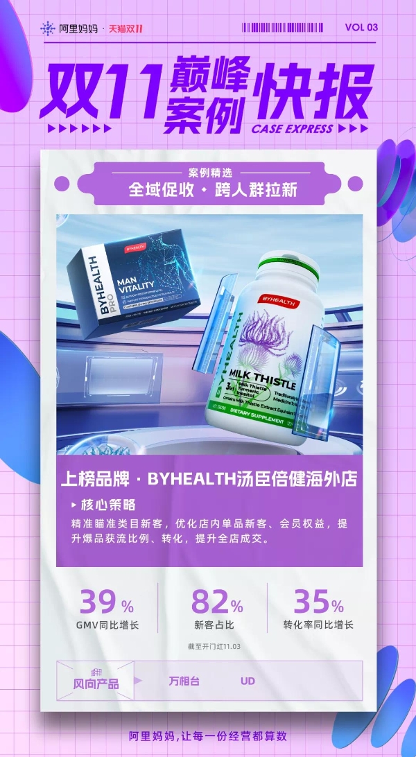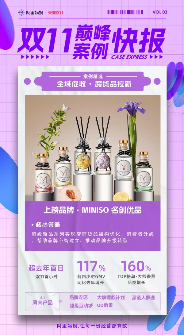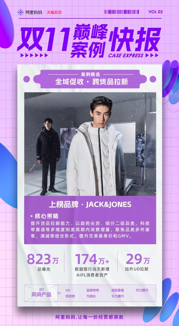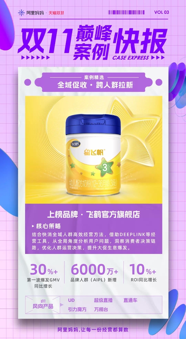 根據(jù)阿里媽媽洞察發(fā)現(xiàn),在天貓雙11最后的沖刺期,抓住嘗鮮型和短決策型消費需求會為商家再創(chuàng)高峰。因此,阿里媽媽針對商家在第三波段的跨品類拉新和人群貨品資產(chǎn)再提效等需求,輸出了第三波段策略和數(shù)智產(chǎn)品應(yīng)用能力,也將更多的經(jīng)營技巧傳遞給商家。