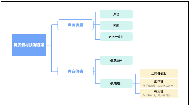 一條優質素材需要在具備內容價值的同時保障聲畫質量。從內容價值角度上看,信息主體要清晰明確,所傳遞出的信息除了需要有正向的價值觀,對用戶來說還應該具備趣味性或者有用性;在聲畫質量角度,需要優質的聲音和舒適的畫面,加上良好的聲畫一致性,這些都是帶給用戶良好觀感體驗的要點。