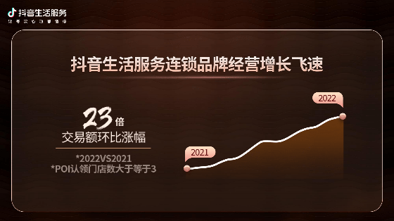 作為餐飲經營新陣地,抖音生活服務不斷為廣大餐飲商家帶來生意增量。如今,抖音生活服務業務覆蓋全國370+個城市,合作門店超200萬家。其中,抖音生活服務POI認領門店數大于等于3的連鎖品牌,2022對比2021年整體交易額環比增長了23倍。這說明,越來越多的連鎖品牌在抖音生活服務的投入產出不斷擴大,打開了長效經營新路徑。