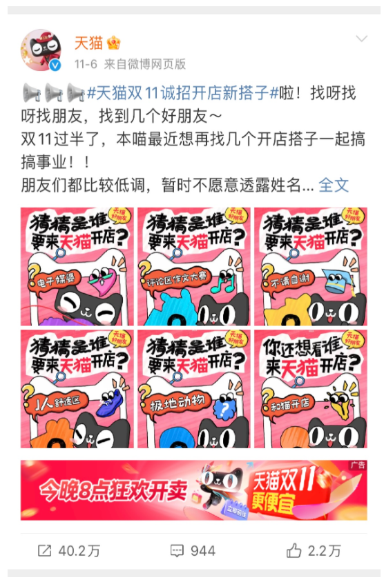 正是洞察到當下的消費者愛磕CP愛看戲的圍觀心理,結合“商戰”話題熱度,天貓打造了邀請朋友一起來開店的事件,立體化表達天貓品牌形象,突出天貓在雙11的主場地位。通過和好朋友們一起上演搶風頭大戲吸引看客圍觀,形成話題勢能,引爆社交媒體,為天貓站內雙11最后3天大狂歡撬動增量。