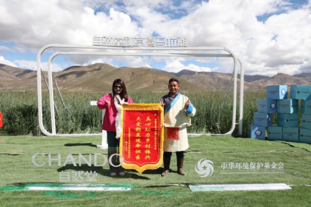 儀式現場,拉孜縣錫欽鄉崗西村村民委員會分別向中華環境保護基金會、上海市第十批援藏干部聯絡組、自然堂集團贈送錦旗。