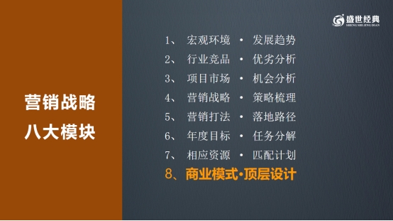 為了讓效果可控可落地,盛世經典構建了營銷戰略八大模塊,從宏觀環境分析到商業模式頂層設計,從競品優劣對比到年度目標分解,形成全鏈路服務體系。無論是幫初創品牌找準賽道,還是助力成熟品牌突破瓶頸,這套體系都能精準匹配需求,提供定制化解決方案。