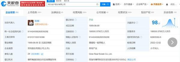 格力地產,這家成立于1999年6月的知名企業,至今已有20余年的歷史。據天眼查App的資料顯示,格力地產的法定代表人為陳輝,公司的注冊資本達到了約18.85億人民幣,是一家實力雄厚的房地產企業。格力地產的背后股東陣容強大,包括珠海投資控股有限公司、馮駿駒、香港中央結算有限公司等多家企業和個人,共同構成了其股權結構。