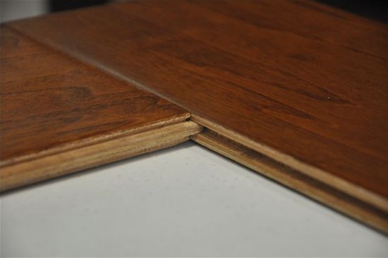 將水滴在地板的拼縫上,靜置5分鐘后拭去水滴,拆開(kāi)地板發(fā)現(xiàn)地板拼縫無(wú)水滲入。可見(jiàn)這款地板的企口工藝和上漆工藝良好。