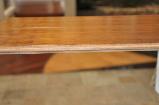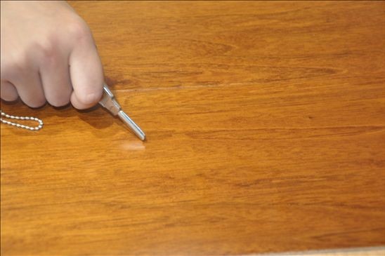 小編用金屬質(zhì)地的鑰匙在地板上來(lái)回刮擦幾次,板面上未留下任何刮痕,這說(shuō)明這款地板的油漆耐磨性能出色。