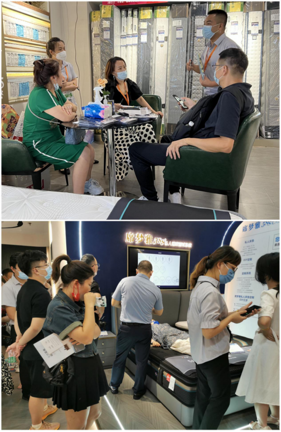 客商們零距離接觸席夢雅的匠心軟體家具產品,親自觸摸床墊柔軟透氣的面料,親自體驗席夢雅“588+測試睡眠系統”,屏幕上顯示人體的心跳頻率、呼吸頻率、體動頻率等參數,席夢雅向現場的客商證明了什么是“360°睡眠定制”。