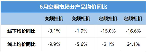 奧維云網(AVC)線下市場監測數據顯示,6月空調線下零售額規模同比下滑12.7%;均價為4098元,同比下滑3.1%。其中,變頻掛機線下均價為3339元,同比下滑3.1%,變頻柜機均價為7895元,同比下滑1.9%,定頻掛機均價為2085元,同比下滑15%,定頻柜機均價為5748元,同比下滑16.6%。