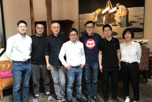 貓眼微影高管合影:微影時代總裁顧思斌(左二)、光線傳媒總裁王長田(左三)、微影時代CEO林寧(左四)、貓眼CEO鄭志昊(右三)